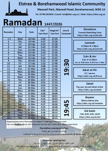 Members of our community will provide Iftar daily. If you are interested in supplying food or contributing financially, please put your name down on the list in the Masjid or contact Brother Amir – 07784 693360